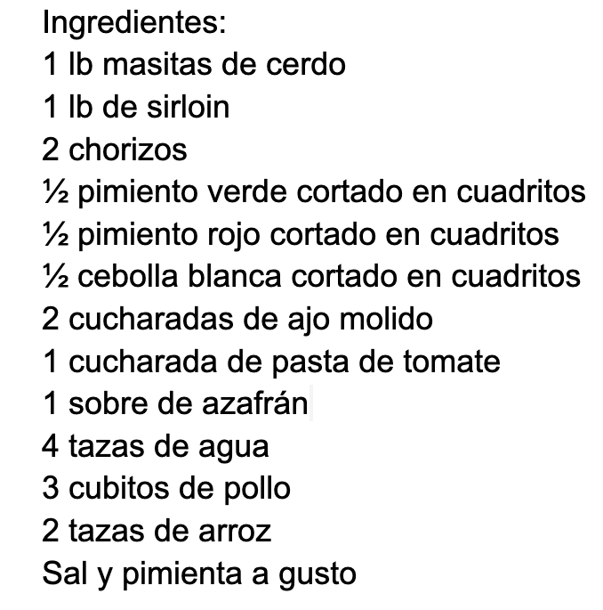 Este plato significa mucho para mí porque lleva los recuerdos de mi viaje a Europa con mi papá y también enseña la transculturación de mi cultura Puertorriqueña y la Española. También es un plato que me recuerda a mi familia y quiero pasar la receta a generaciones de mi familia.